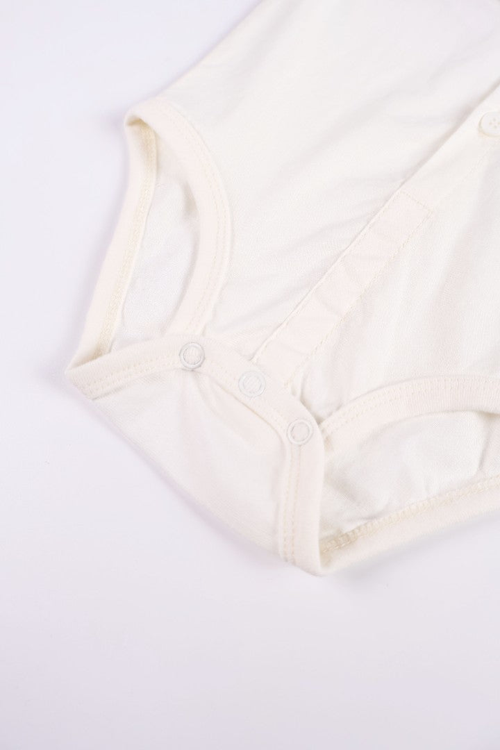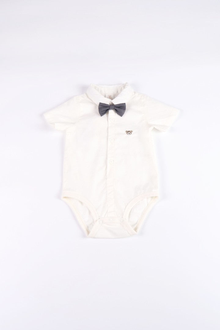 Romper with a collar and short sleeves. Button-up front. Featuring a bear embroidery on the chest and a removable bow-tie.