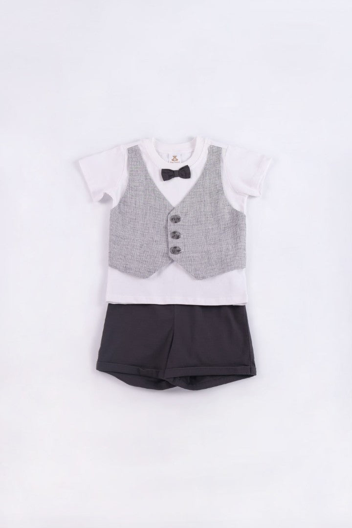 Suit set with a T-shirt with bow-tie and vest, with elastical short pants.