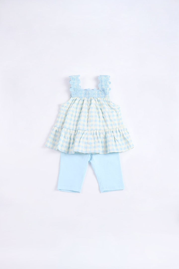 Set comes with blouse and a pair of lenggings. Blouse with straight cut neckline and straps. Button fastening at the back.