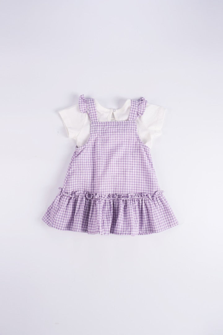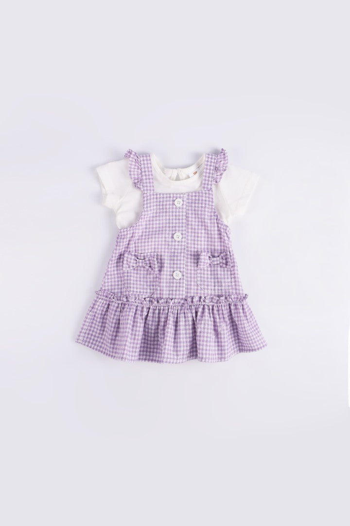 Dungaree dress with straight cut neckline and button-up front. Ruffled trim. Featuring front patch pockets with ribbon appliqué. T-shirt with a round neckline and short sleeve.