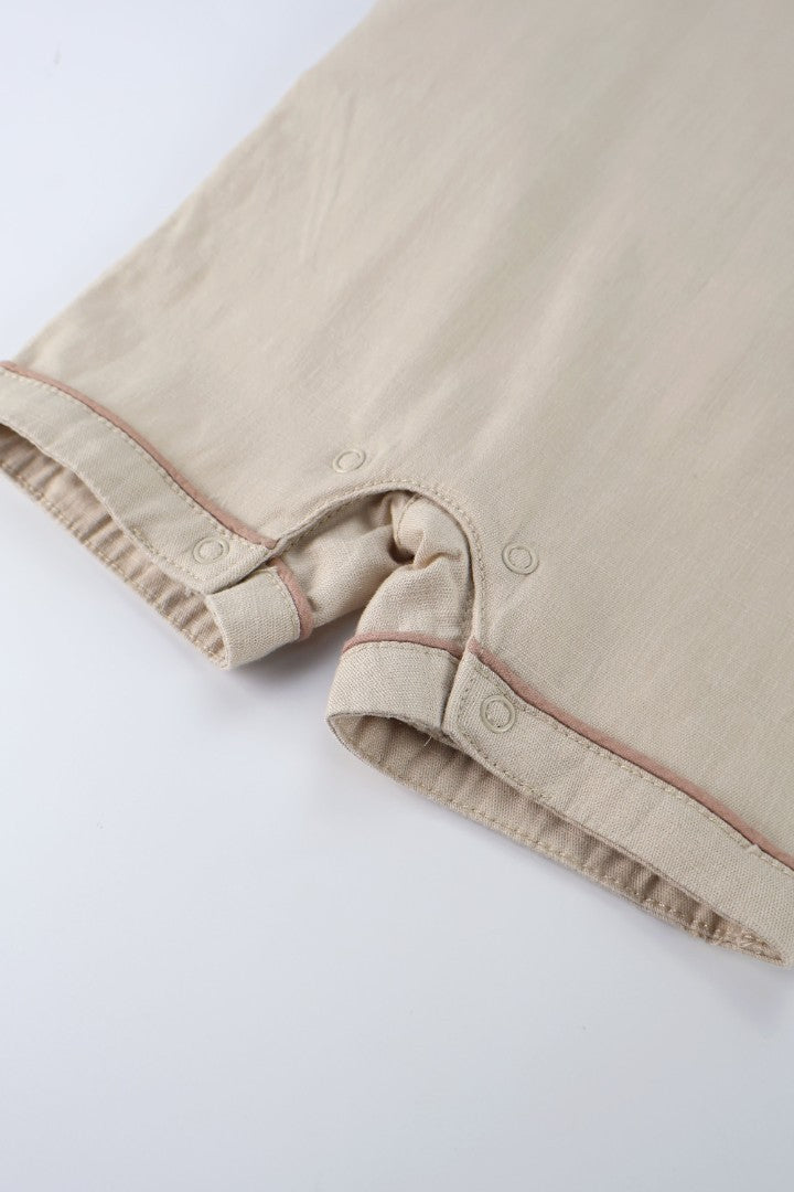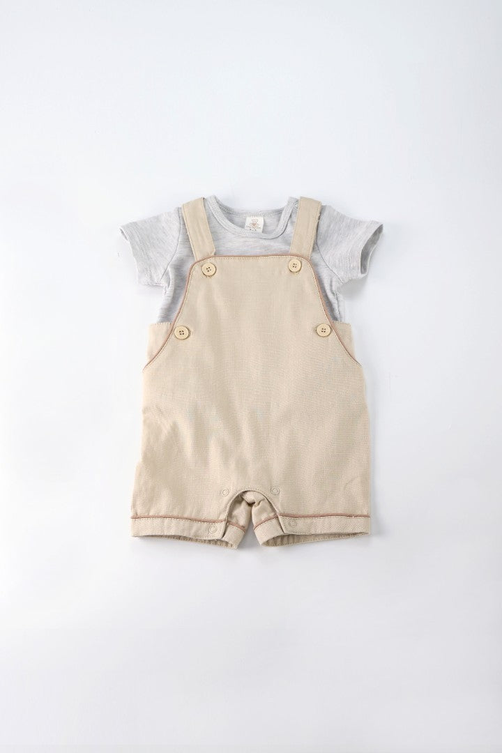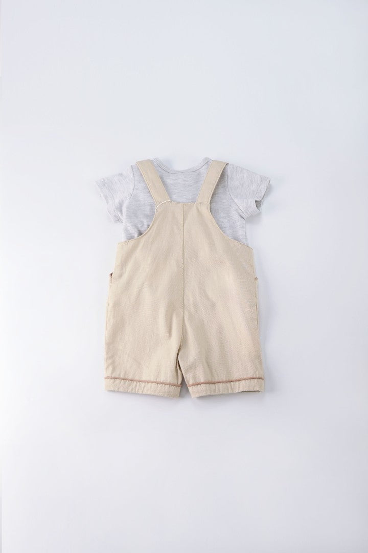 Dungaree with straight neckline and adjustable buttoned straps. Button fastening on the sides. Snap-button at the crotch. T-shirt with round neckline and short sleeve.