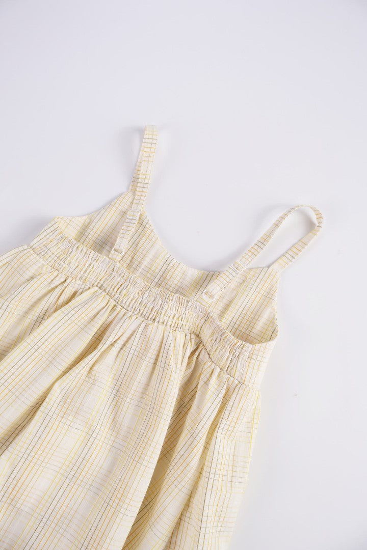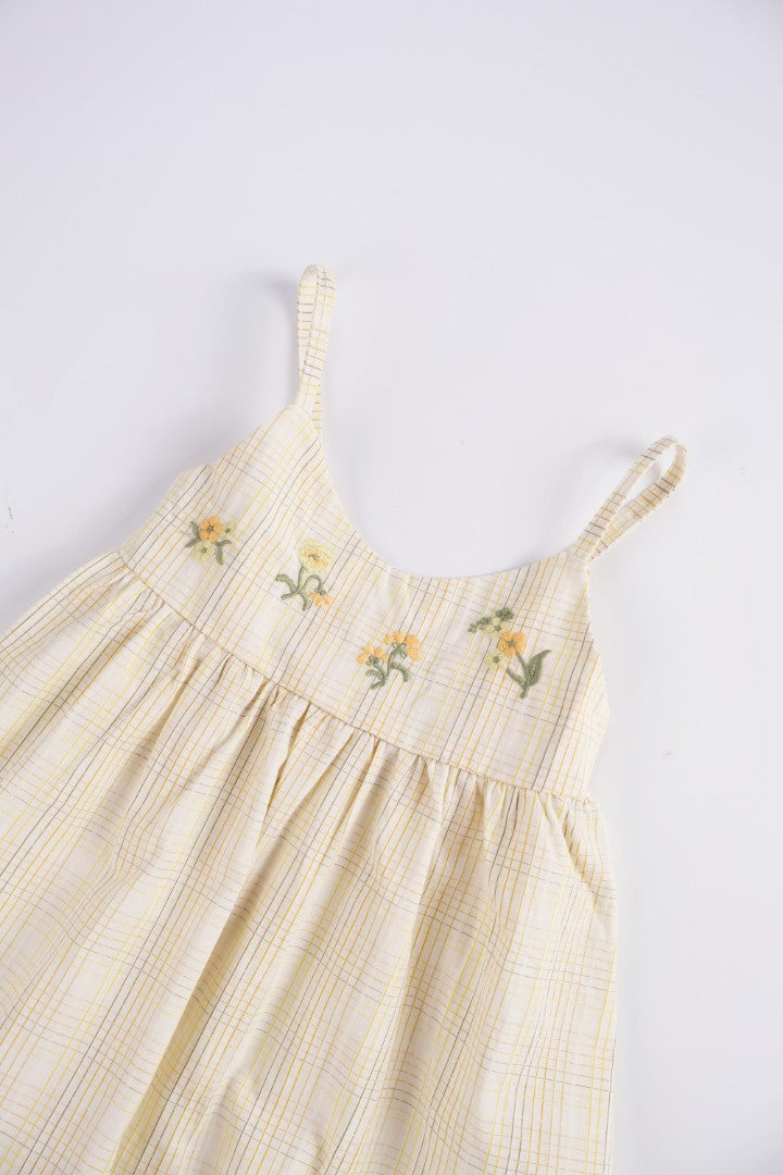 Dress with straight-cut neckline and adjustable straps. Featuring embroideries at the yoke. Smocked detail at the back.