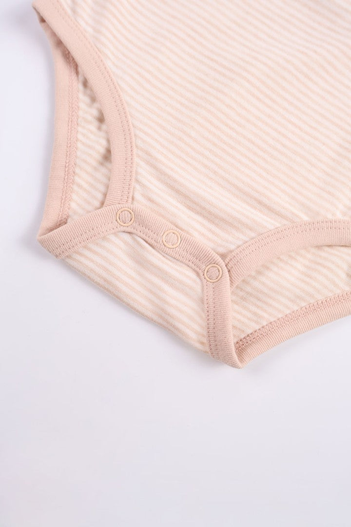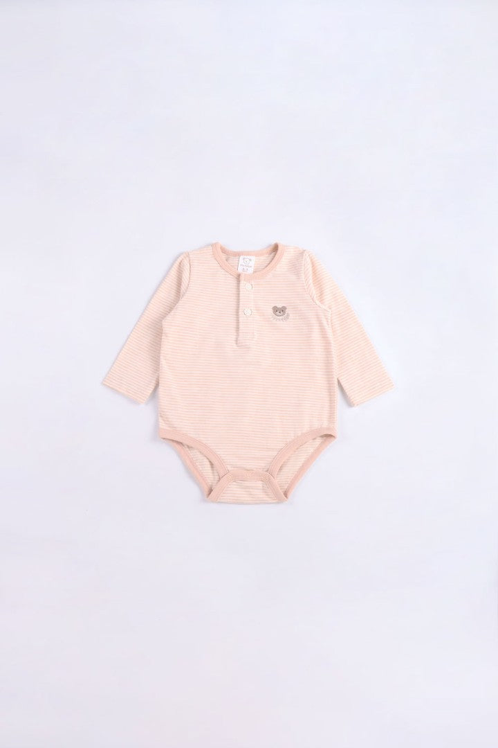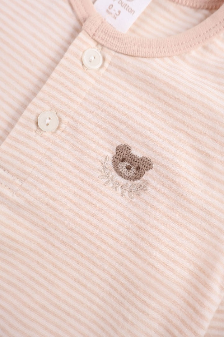 Romper with round neckline and long sleeve. Buttoned henley placket. Featuring embroidery on the chest.