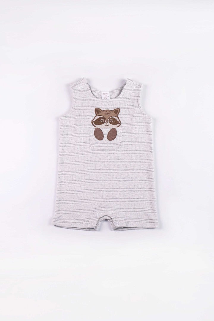 Sleeveless romper with a round neckline and a front patch pocket featuring embroidered detail. Press-stud on the shoulder and crotch.