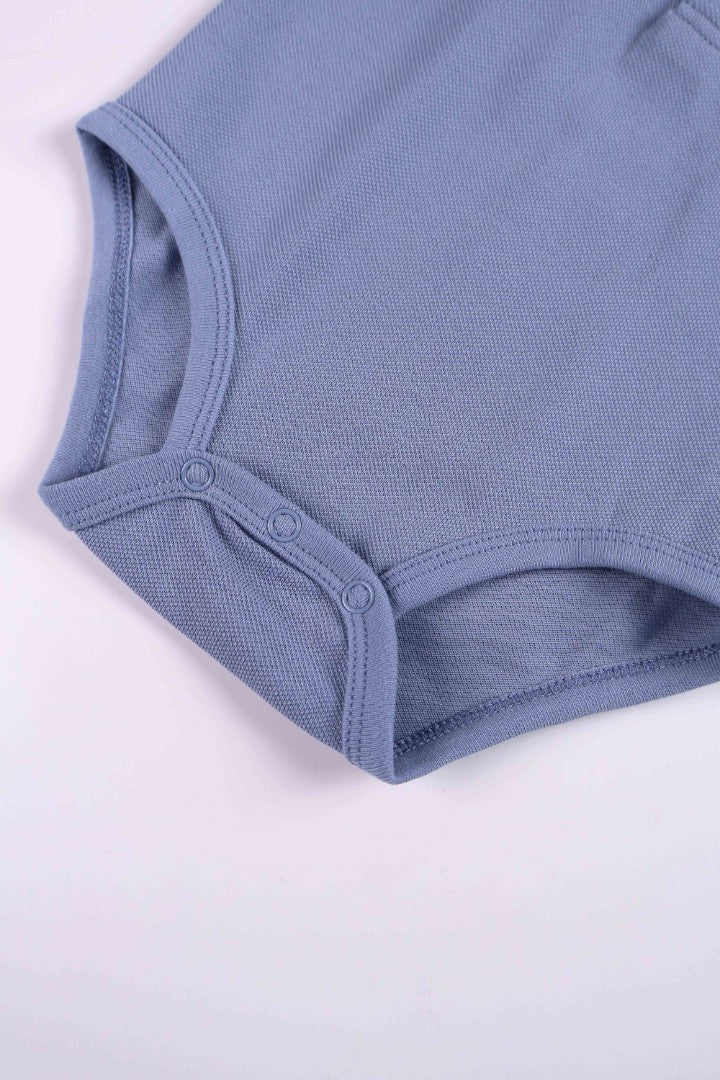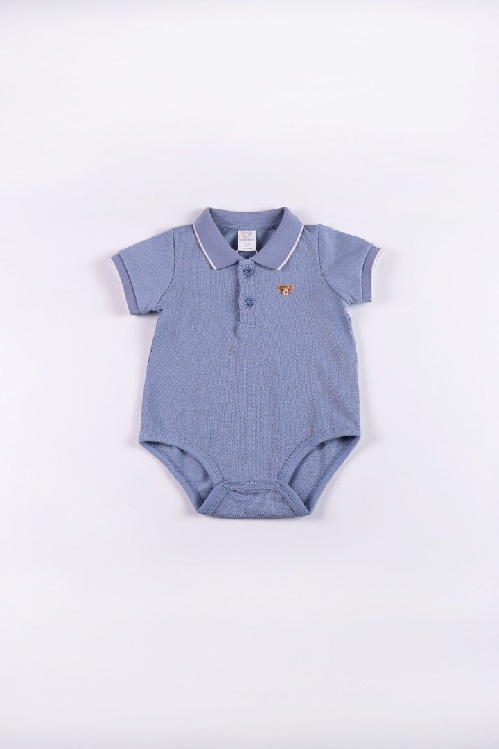 Romper with a collar and a buttoned henley placket. Featuring a embroidery on the chest. Press-stud on the crotch.