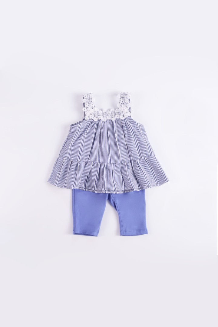 Set comes with top and a pair of leggings. Top with straight cut neckline and straps. Button fastening at the back.