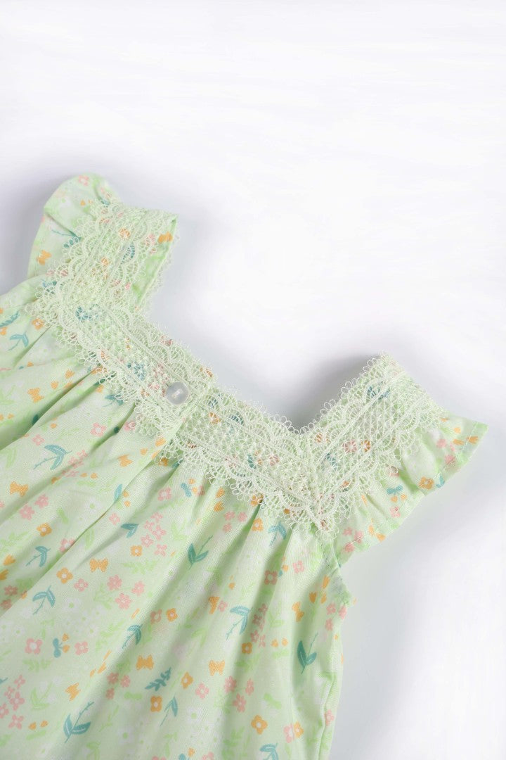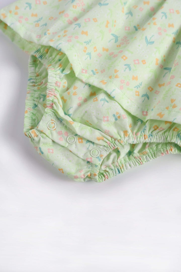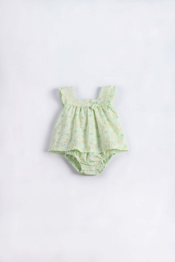Romper in straight cut neckline. Featuring ribbon applique on the strap. Snap-buttoned fastening at the crotch. Elasticated hem.