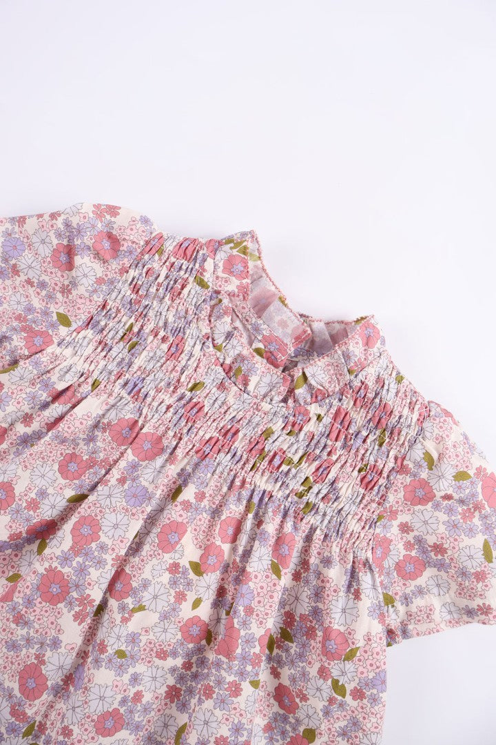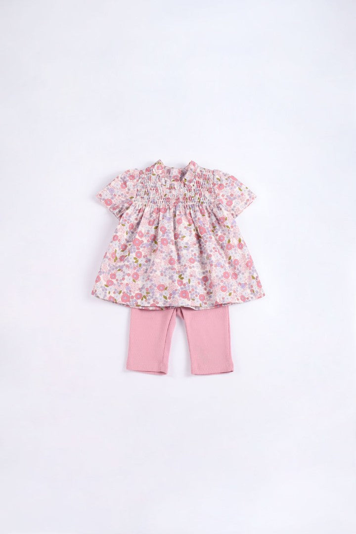 Set comes with blouse and a pair of lenggings. Blouse with round neckline and short sleeve. Featuring smocked details on the yoke. Button fastening at the back.
