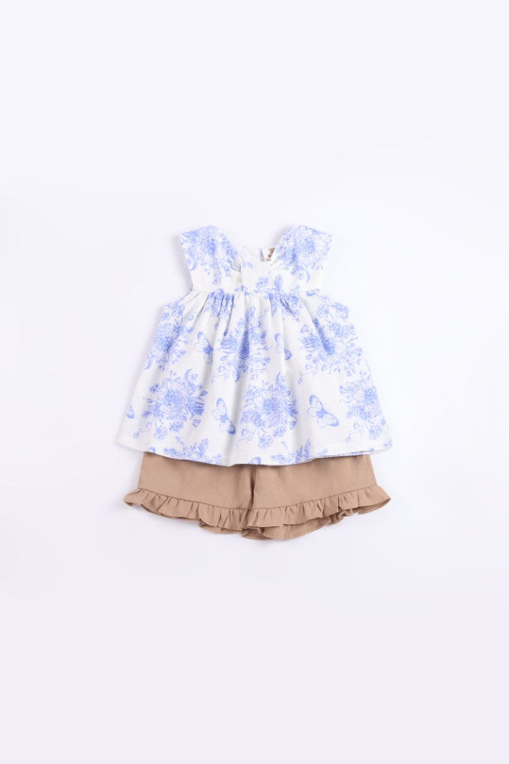 Set comes with blouse and a pair of lantern shorts. Blouse with V-neckline and straps. Featuring all-over floral prints. Button fastening at the back.