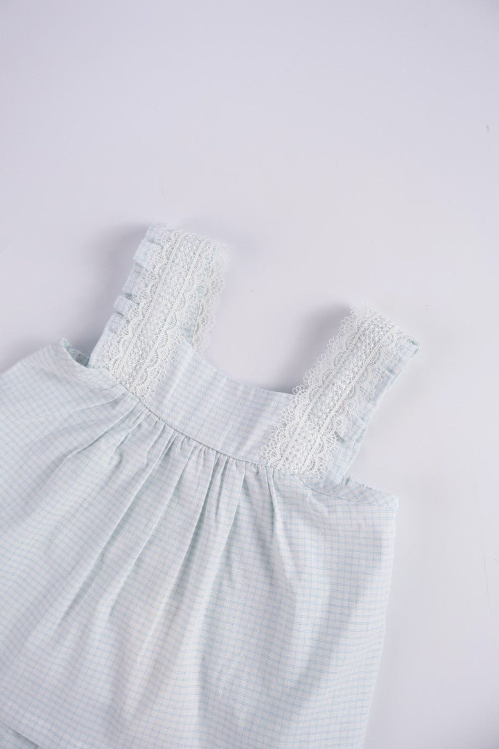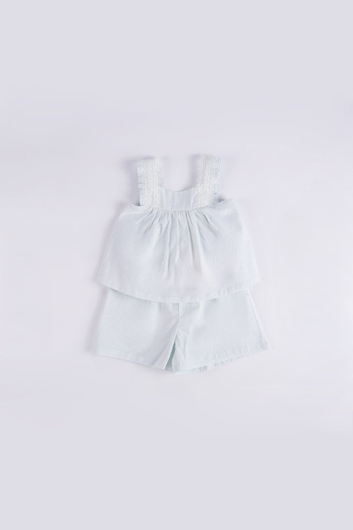 Set comes with blouse and a pair of lantern shorts. Blouse with straight-cut neckline and straps. Elasticated details at the back.