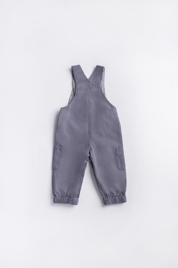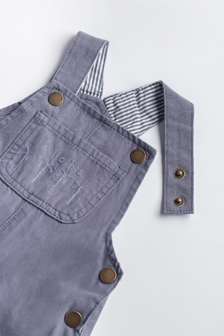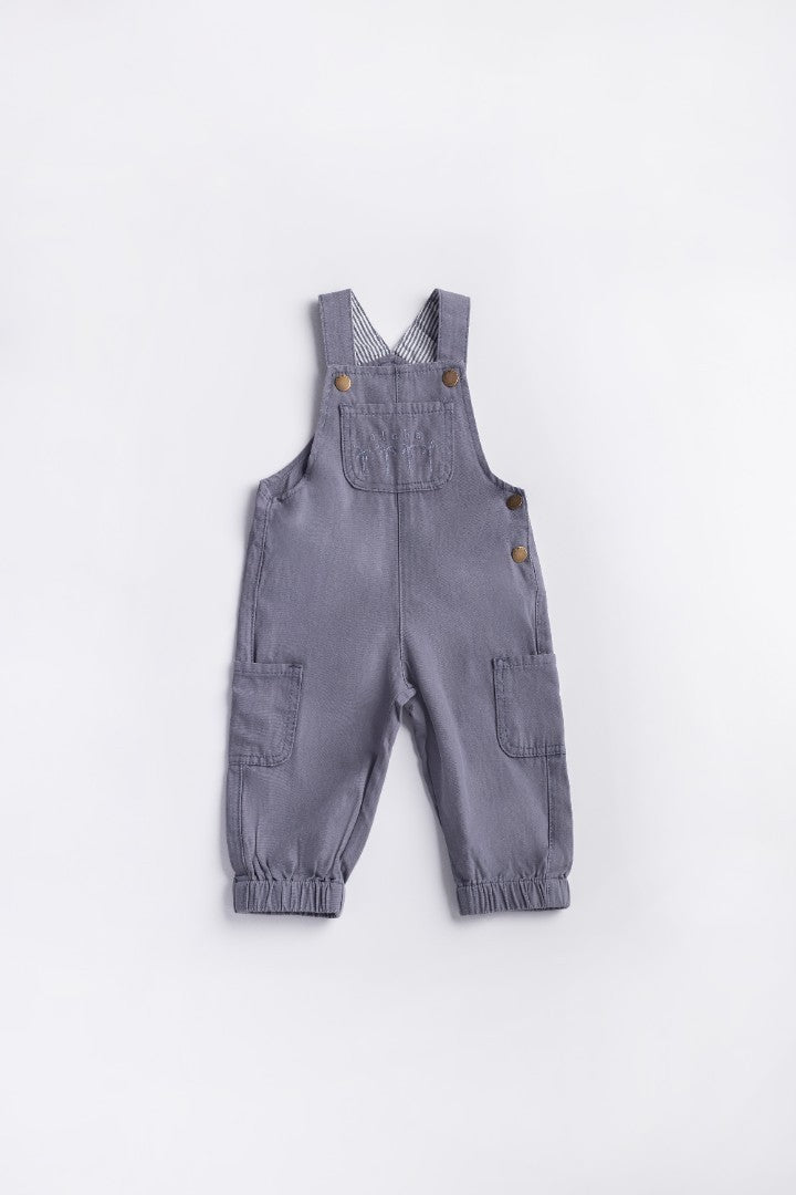 Denim dungaree with straight cut neckline and adjustable straps. Featuring embroidery on the front. Button fastenings on the sides. Front pockets and back patch pockets.