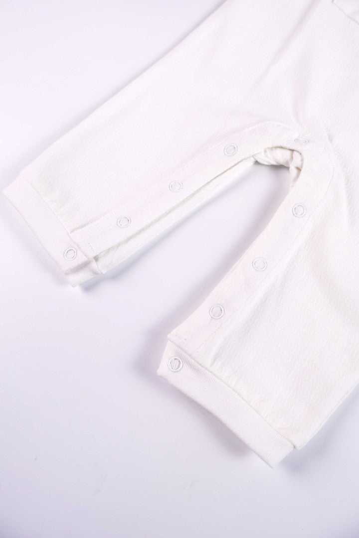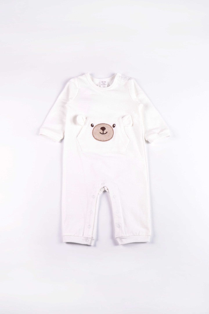 Soft cotton jersey romper with a round neckline and long sleeves. Features a front patch pocket with embroidery detailed and press-studs on the left shoulder and crotch for easy dressing.
