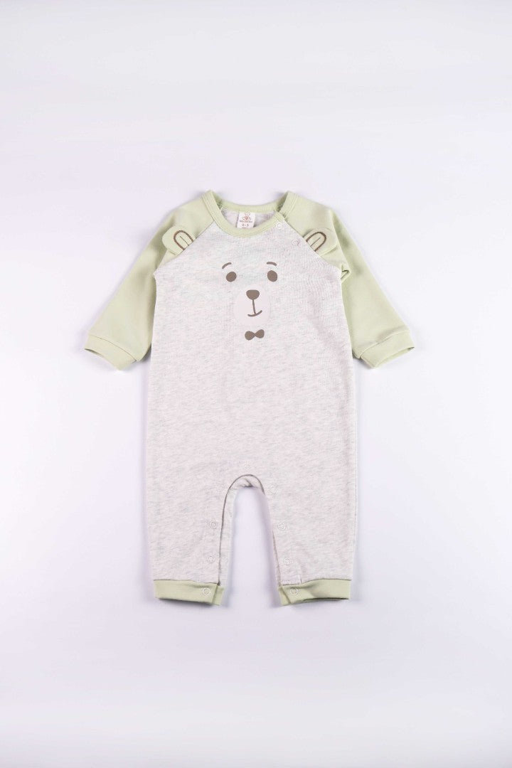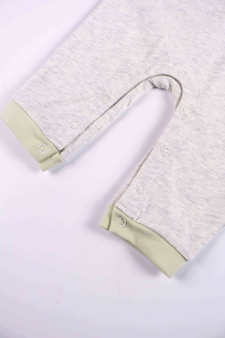 Soft cotton jersey romper with a round neckline and long sleeves. Features graphic prints on the front. Press-studs on one shoulder and at the crotch for easy dressing.