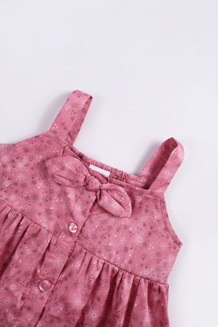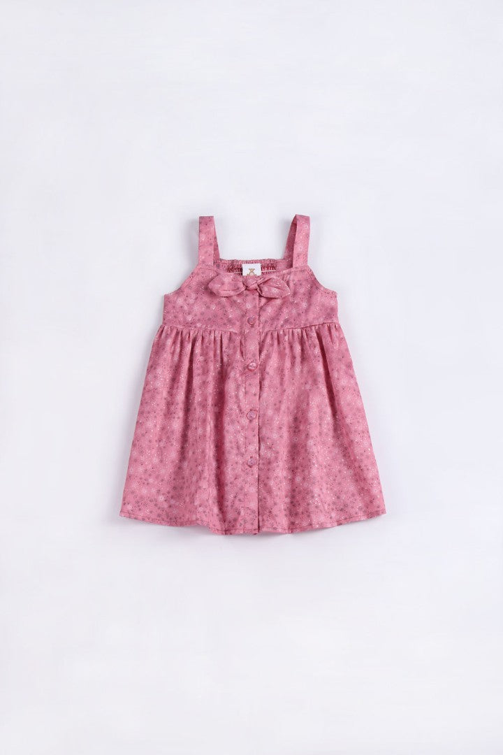Dress with straight cut neckline and straps. Button-up front. Featuring a ribbon appliqué. Smocked details at the back.