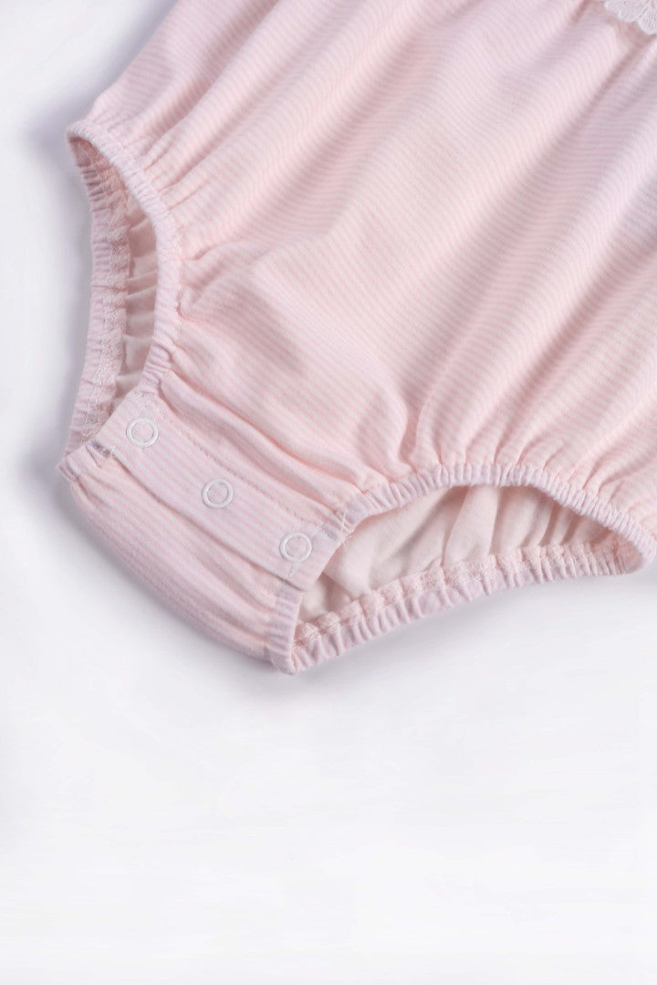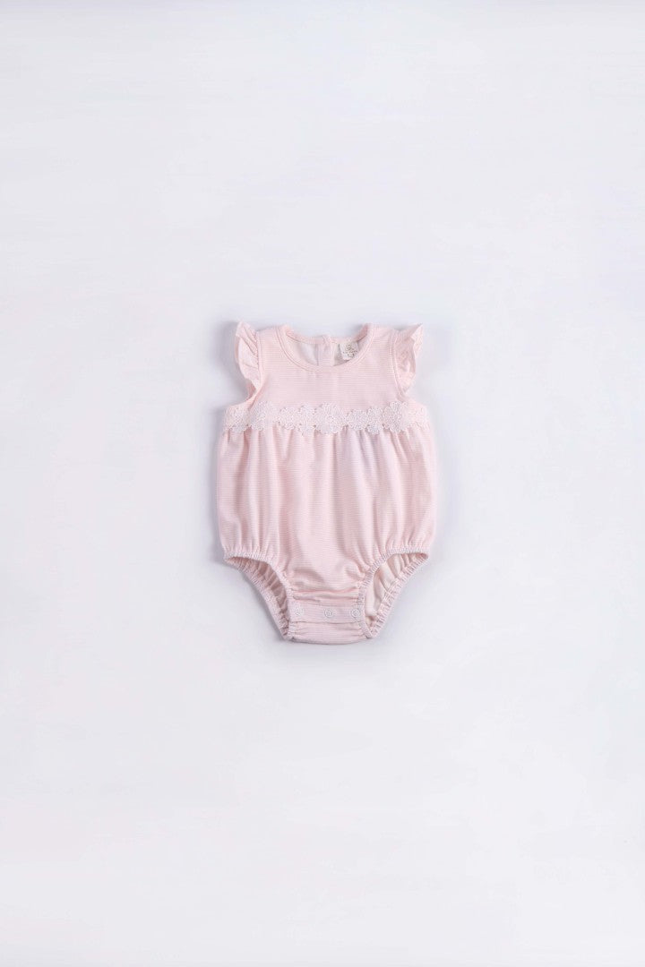 Romper in soft cotton jersey with round neckline. Featuring lace applique on the yoke. Press-studs at the crotch. Button fastening at the back.