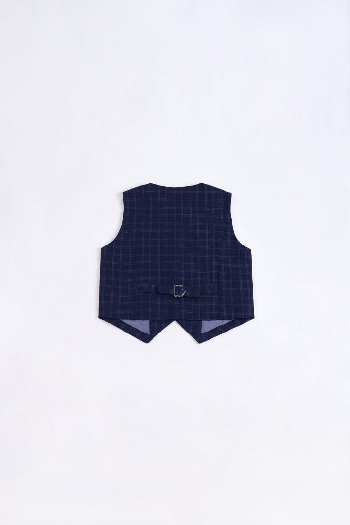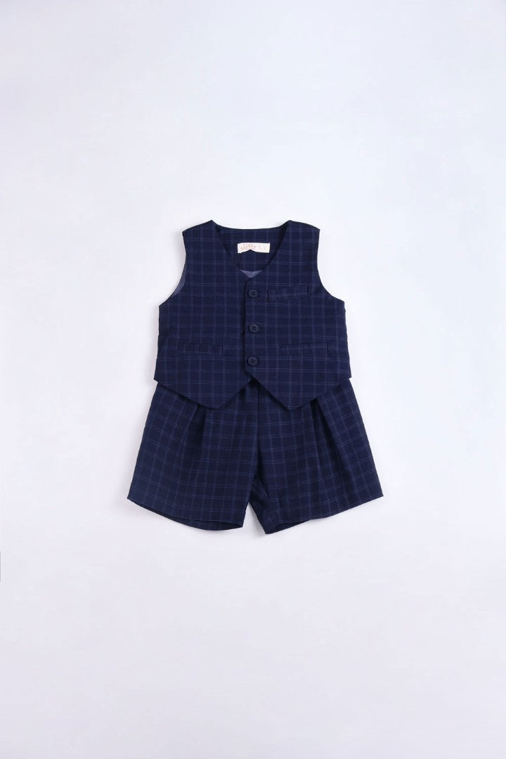 Suit set come with a waistcoat and bermuda shorts. Waistcoat featured a V-neck and sleeveless design. Front button fastening. Bermuda shorts with an elastic waistband.